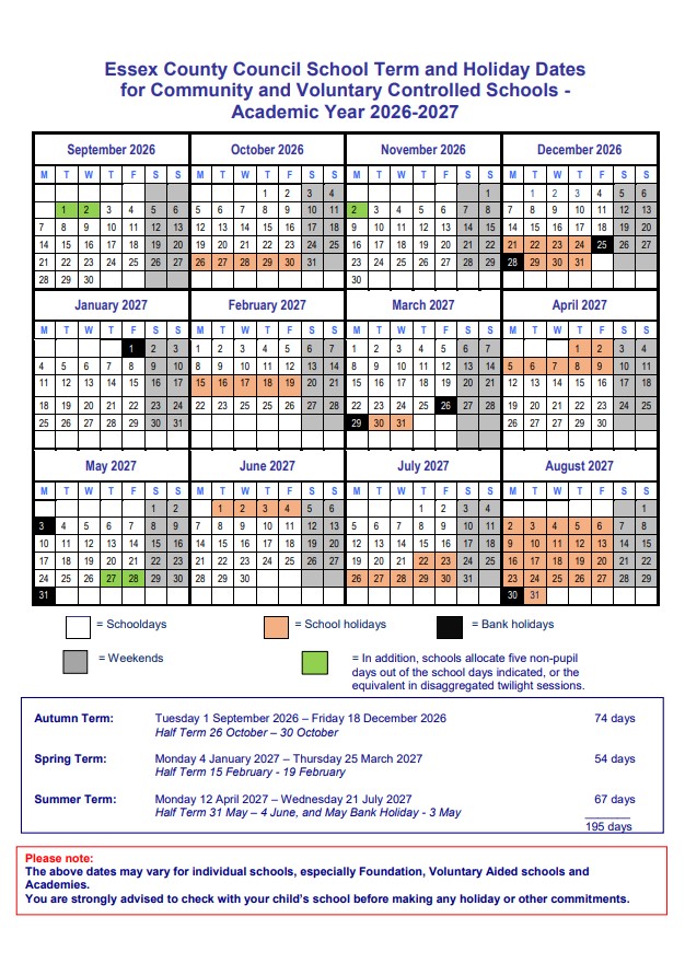 Please see below our term and holiday dates in accordance with Essex County Council agreed term and holiday dates: